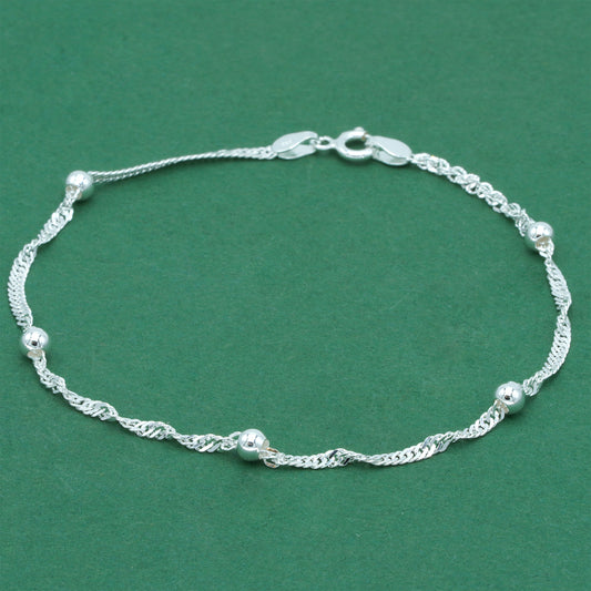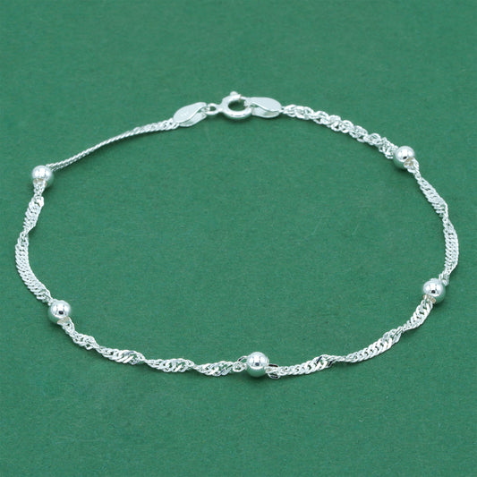 925 Sterling Silver Beaded Singapore Chain Anklet, Twisted Rope Minimal Silver Ankle Bracelet, Delicate Everyday Jewellery