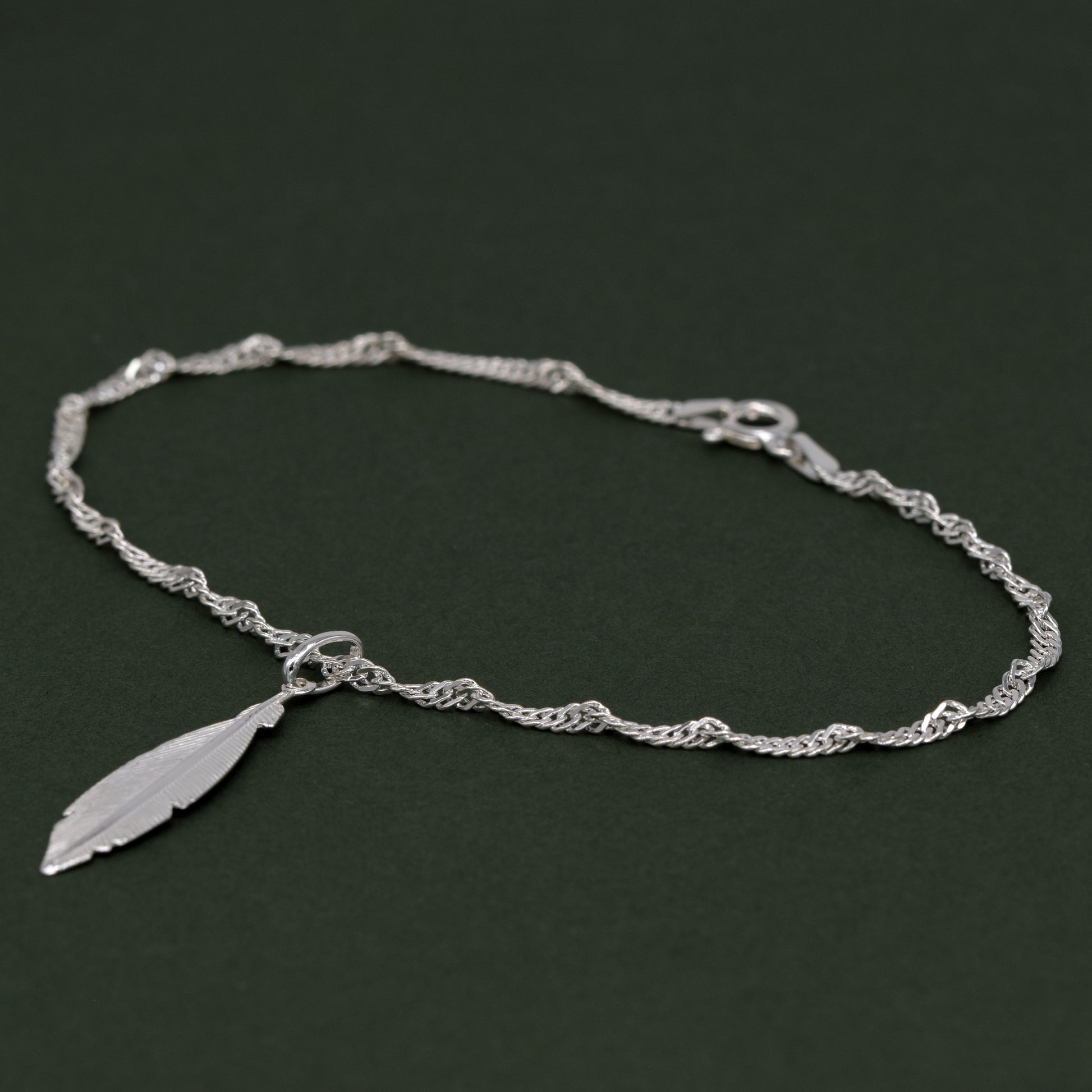 Sterling Silver 10" Singapore Chain Anklet With Feather Pendant