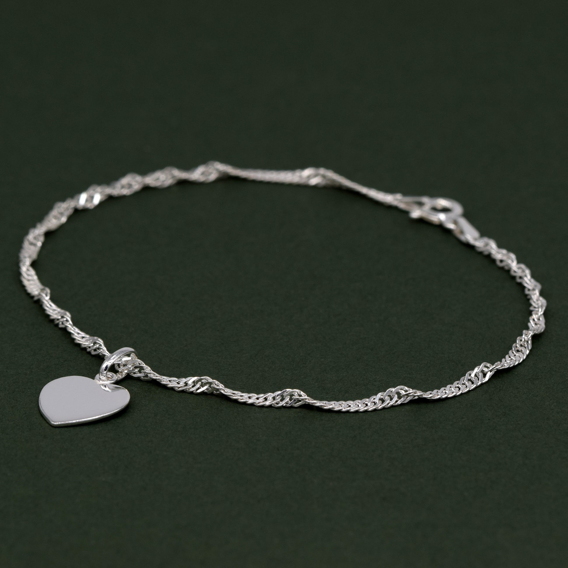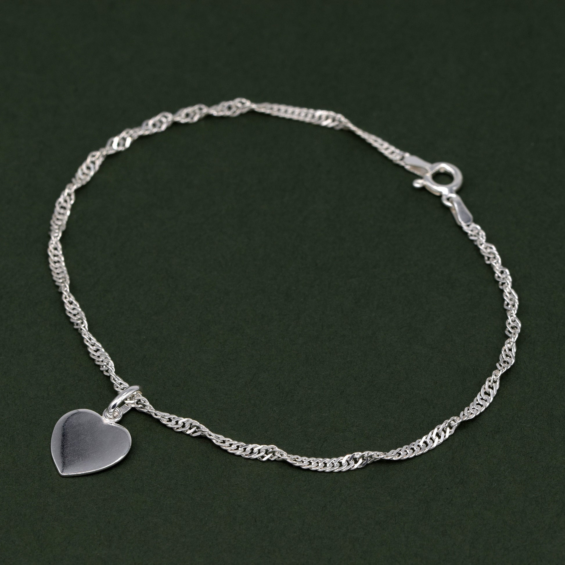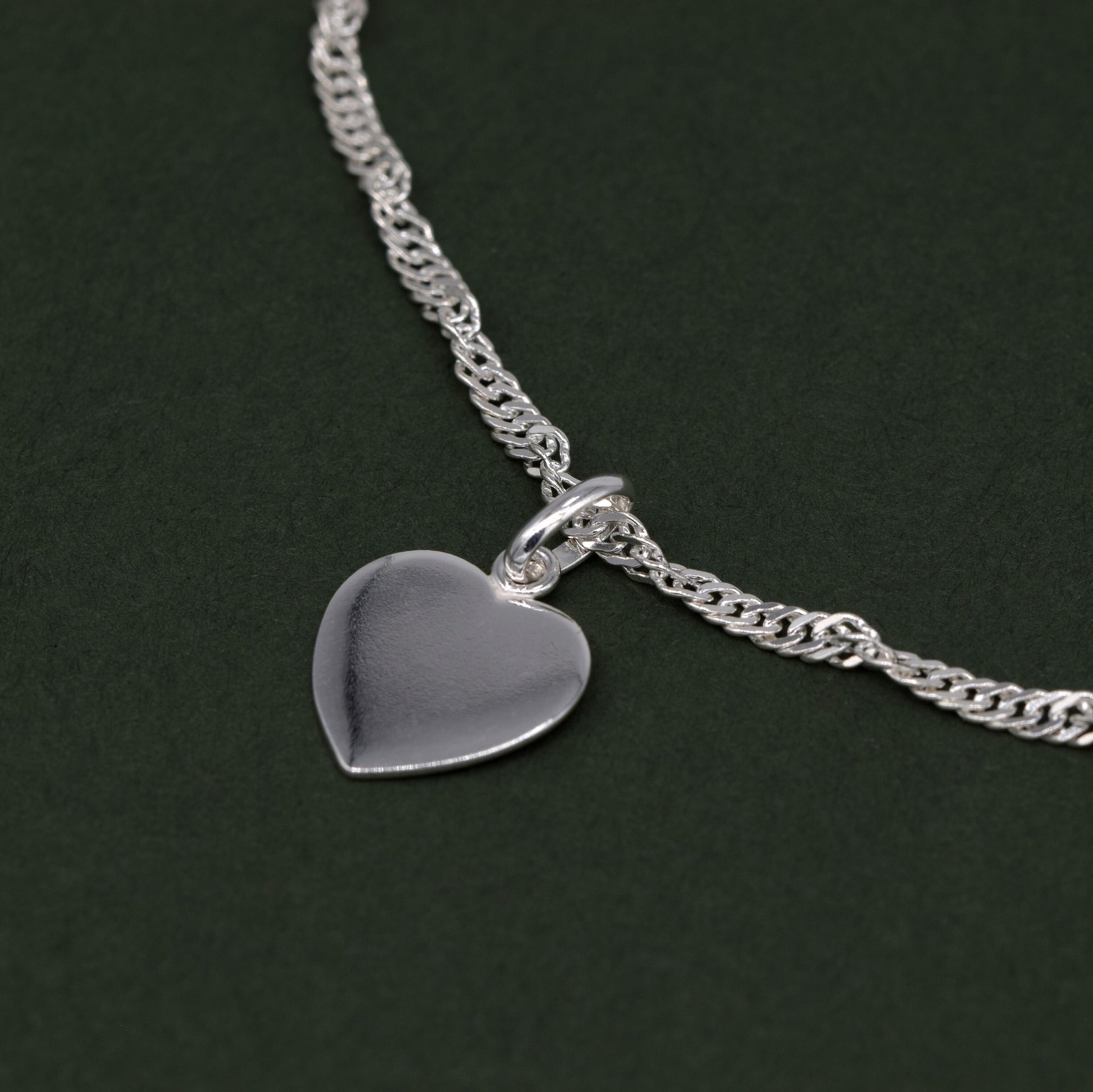 Sterling Silver 10" Singapore Chain Anklet With Flat Heart Pendant