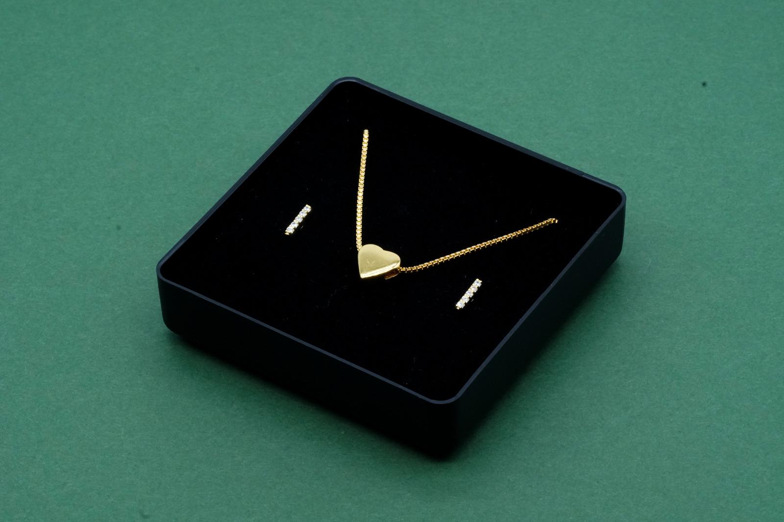 Gold Plated Sterling Silver Heart Charm Necklace with Gold CZ Bar Studs Gift Box